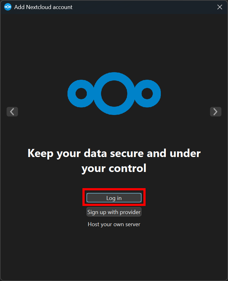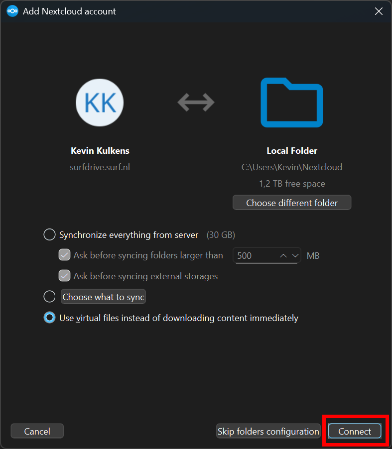 | Now return to the application, you should see the "Add Nextcloud account" window. Make sure that the local folder is set to your local drive (e.g. C:\Users\<username>\Nextcloud). Click on Connect. | ![]() |